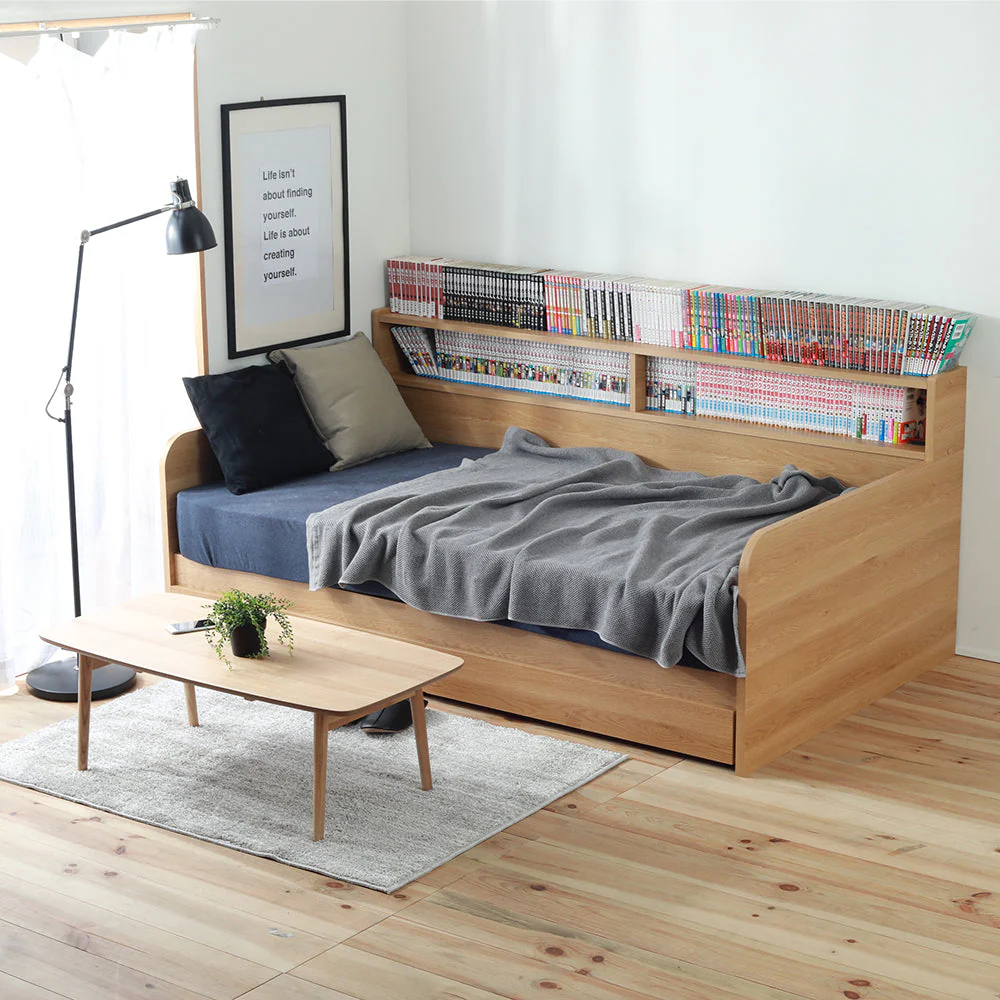 この商品の特徴は、ベッド上部の収納棚です。日中くつろぐ際や、夜寝る前に使用するものを置けるため、デイベッドで快適に過ごすことができます。